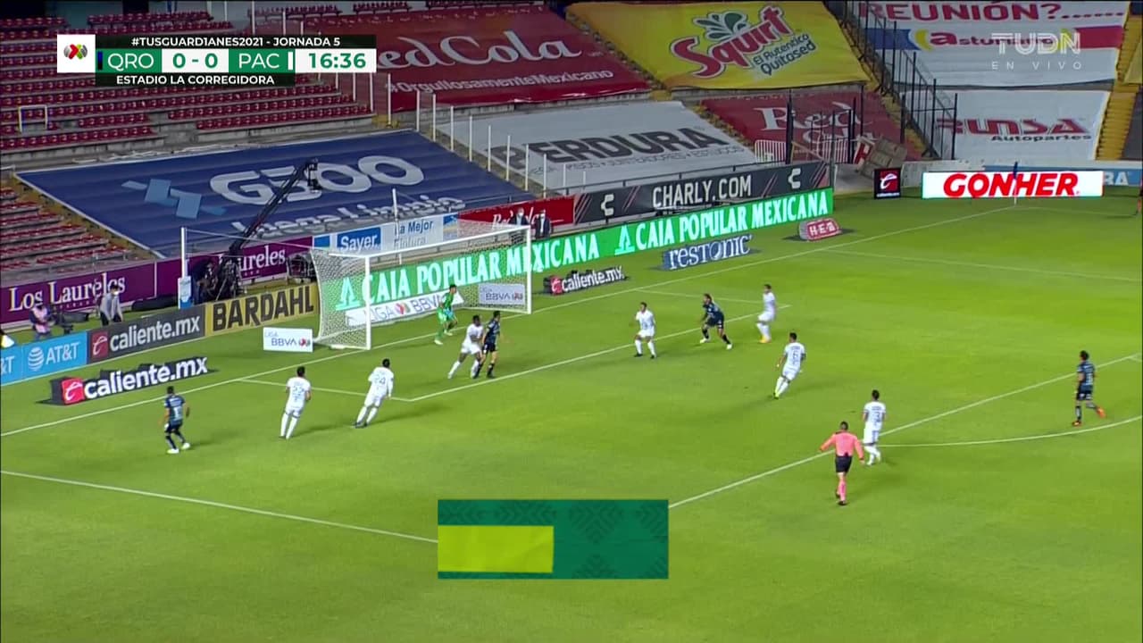 Tiro atajado raso al centro del arco. Francisco da Costa (Querétaro) disparo de cabeza desde el centro del área. Asistencia de Jefferson Montero con un centro al área.