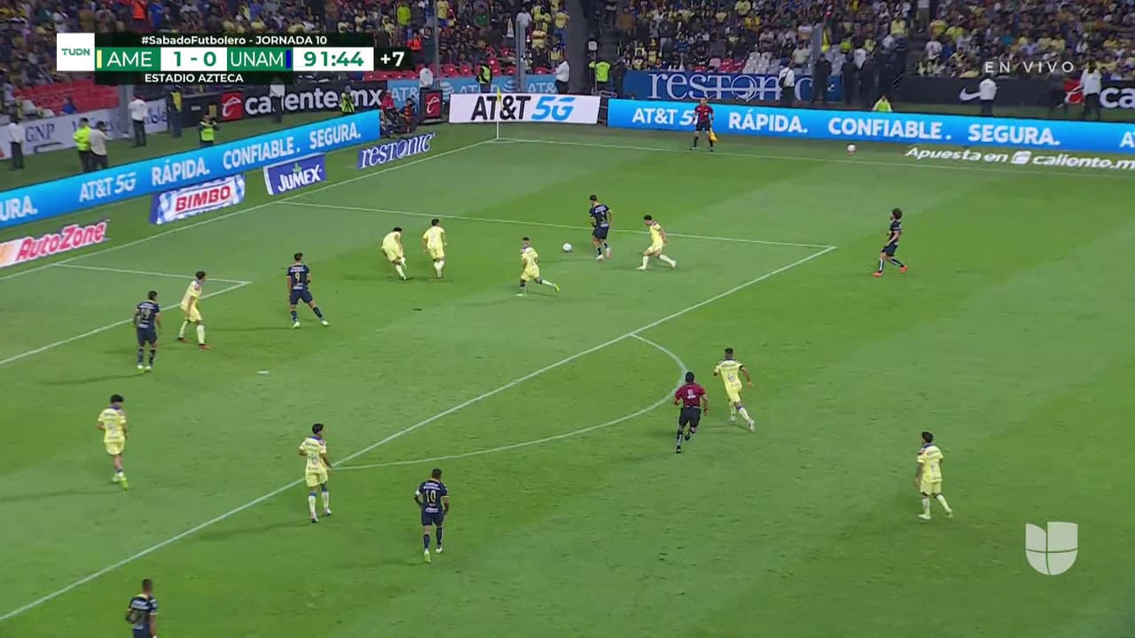 Tiro atajado Por arriba en el centro del arco. Gabriel Fernández (Pumas UNAM) disparo de cabeza desde el centro del área. Asistencia de Pablo Bennevendo.