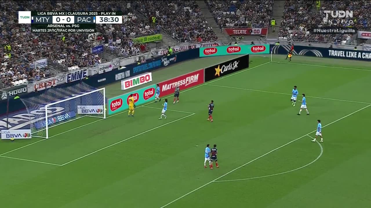 Tiro atajado. Germán Berterame (Monterrey) Disparo con la derecha desde el lado derecho dentro del área.