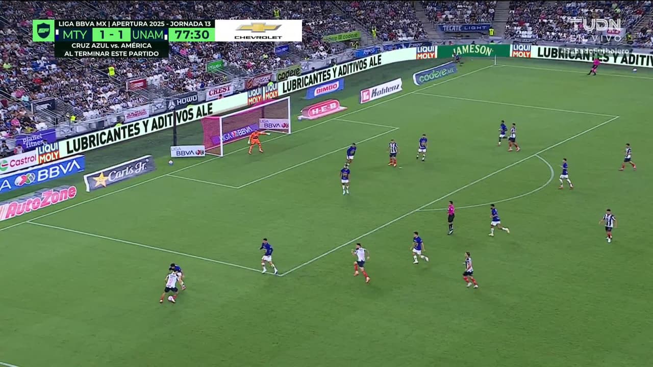 Tiro atajado. Germán Berterame (Monterrey) disparo de cabeza desde el centro del área.