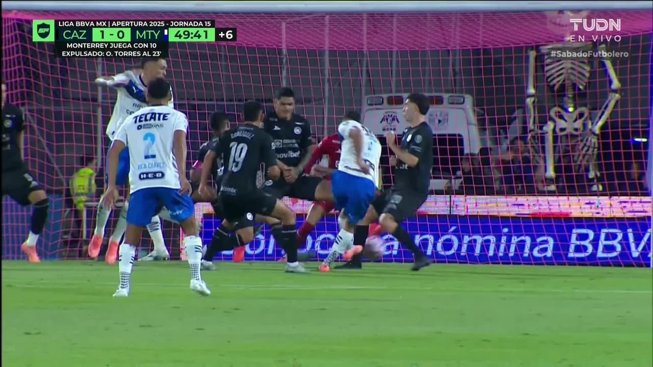 Tiro atajado. Germán Berterame (Monterrey) Disparo con la derecha desde el centro del área.