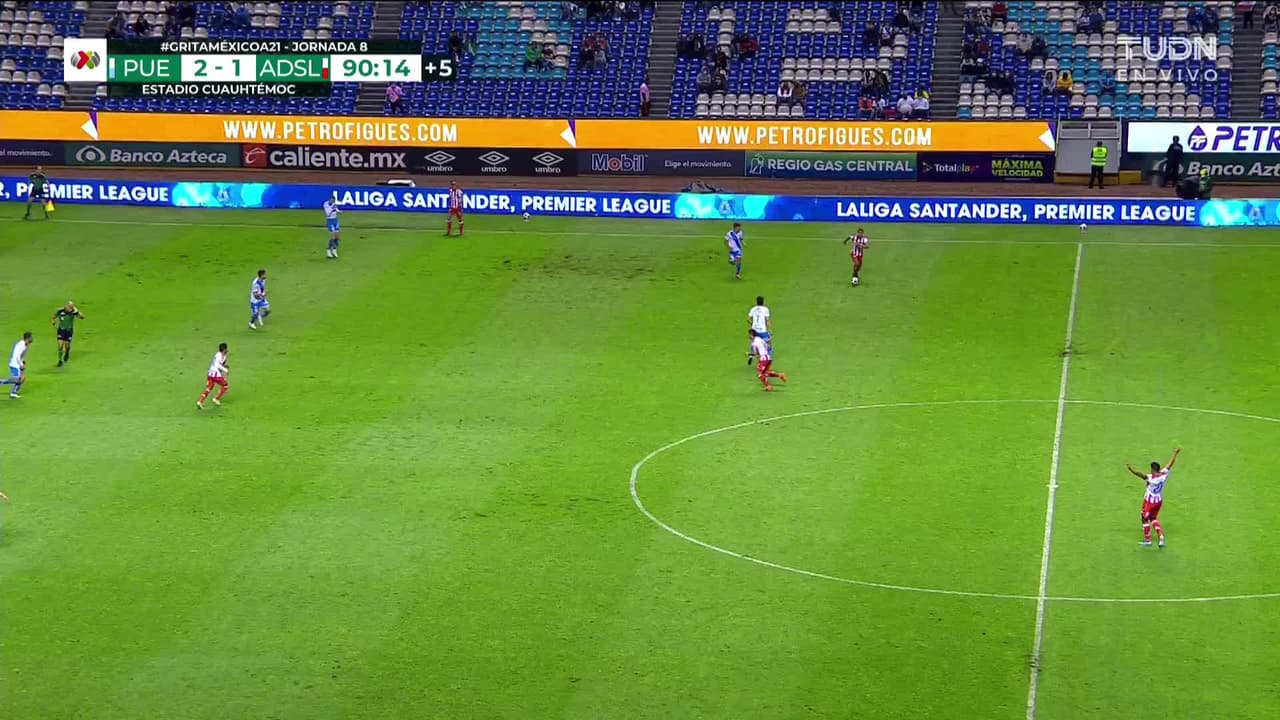 Remate parado junto al lado derecho de la portería. Germán Berterame (Atlético San Luis) remate con la izquierda desde el centro del área.