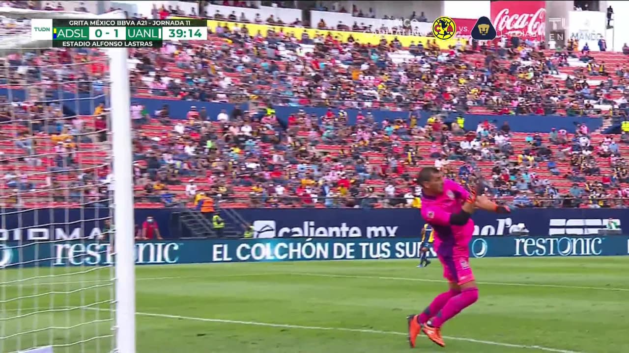 Remate parado bajo palos a rás de suelo. Germán Berterame (Atlético San Luis) remate con la izquierda desde el centro del área. Asistencia de Ricardo Chávez.