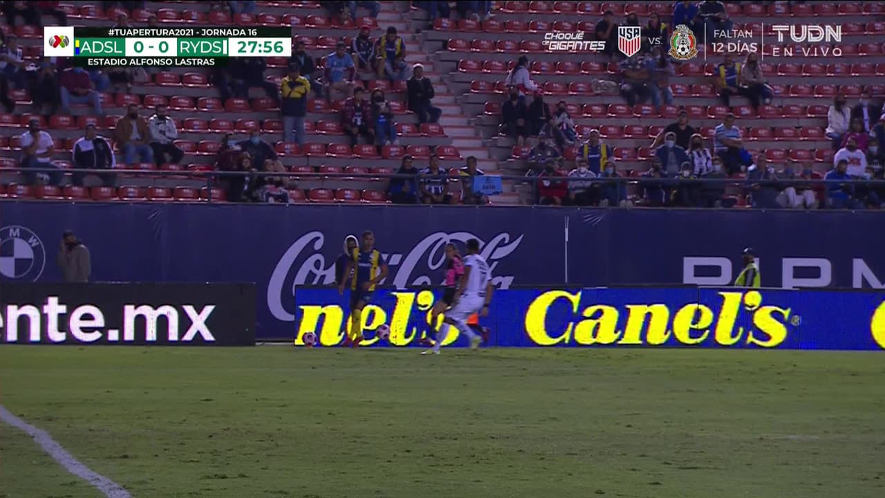 Tiro atajado al ángulo superior derecho. Germán Berterame (Atlético San Luis) disparo de cabeza desde el centro del área.