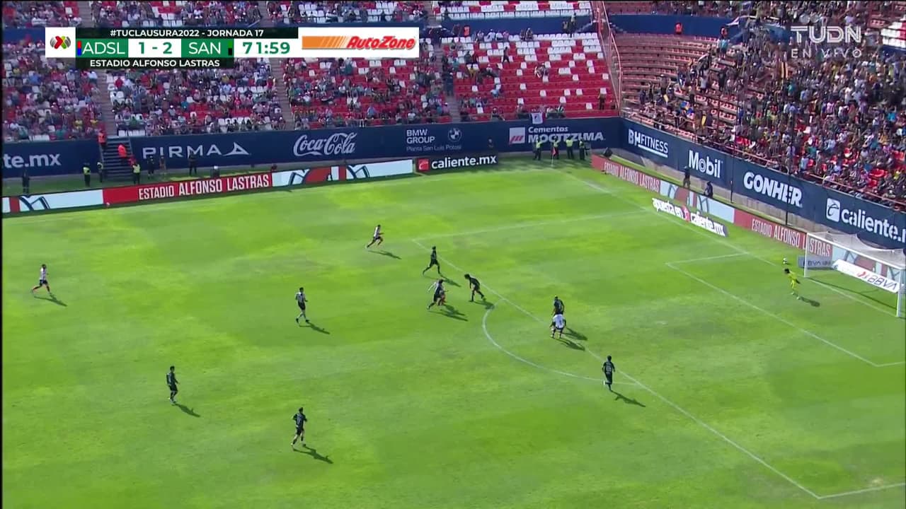 Tiro atajado raso al centro del arco. Germán Berterame (Atlético San Luis) Disparo con la derecha desde el lado izquierdo dentro del área. Asistencia de Andrés Iniestra después de un pase en profundidad.