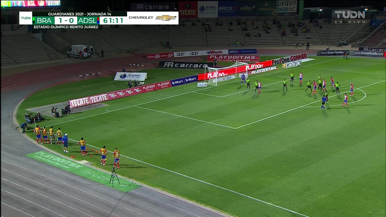 Tiro atajado junto al lado derecho de la portería. Germán Berterame (Atlético San Luis) disparo de cabeza desde el centro del área. Asistencia de David Rodriguez con un centro al área.