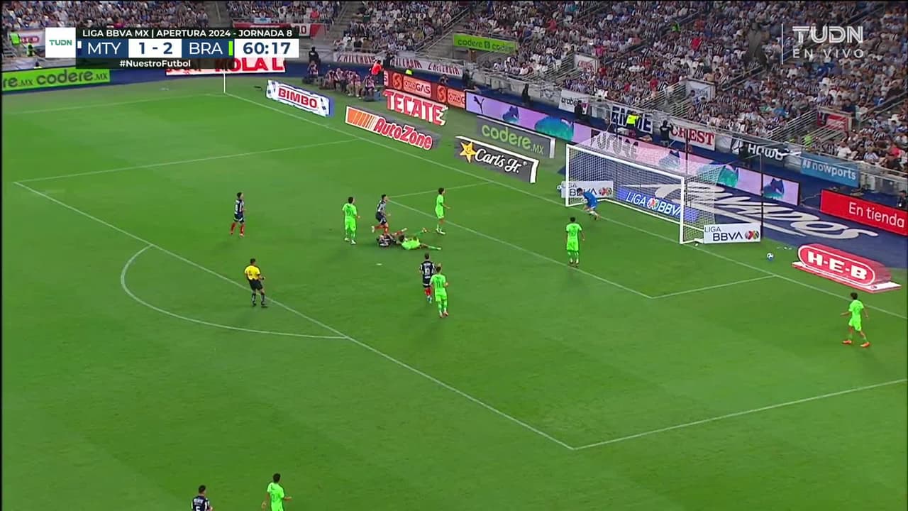 Tiro atajado. Germán Berterame (Monterrey) disparo de cabeza desde el centro del área.
