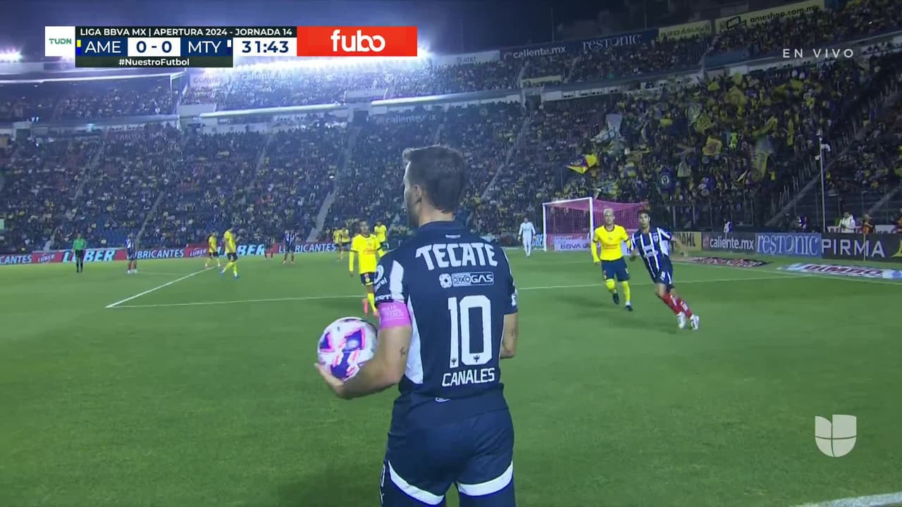 Tiro atajado. Germán Berterame (Monterrey) disparo de cabeza desde el lado derecho dentro del área.