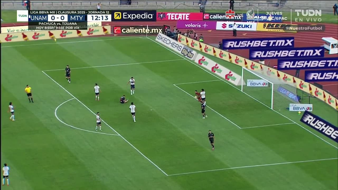 Tiro atajado. Germán Berterame (Monterrey) zurdazo desde el centro del área.