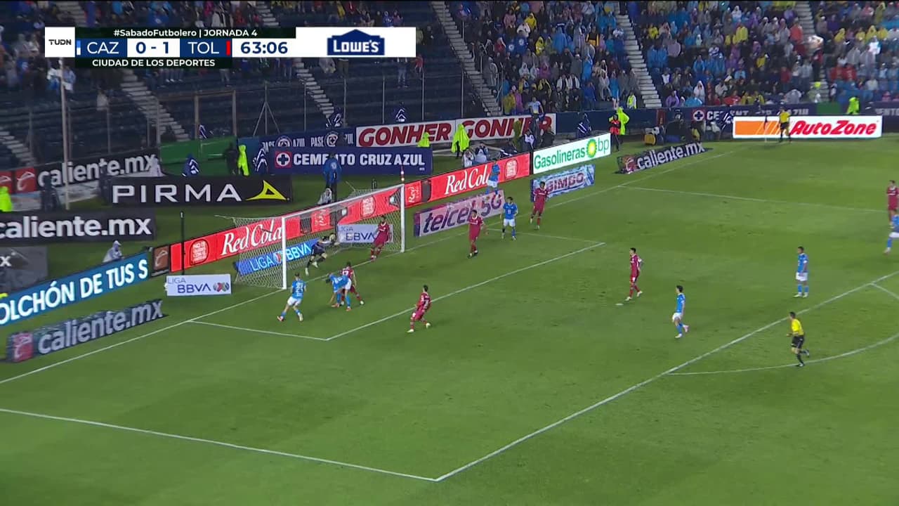 Tiro atajado Por arriba en el centro del arco. Giorgos Giakoumakis (Cruz Azul) disparo de cabeza a quemarropa desde el lado izquierdo. Asistencia de Jorge Sánchez con un centro al área.