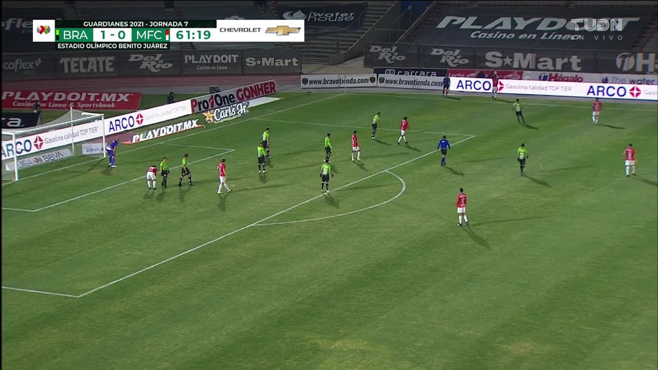 Tiro atajado junto al lado derecho de la portería. Giovanni Augusto (Mazatlán FC) Disparo con la derecha sin ángulo desde la derecha. Asistencia de Camilo Sanvezzo.
