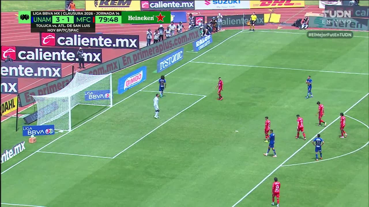 Tiro atajado junto al lado derecho de la portería. Guillermo Martínez (Pumas UNAM) zurdazo desde fuera del área. Asistencia de Pedro Vite.