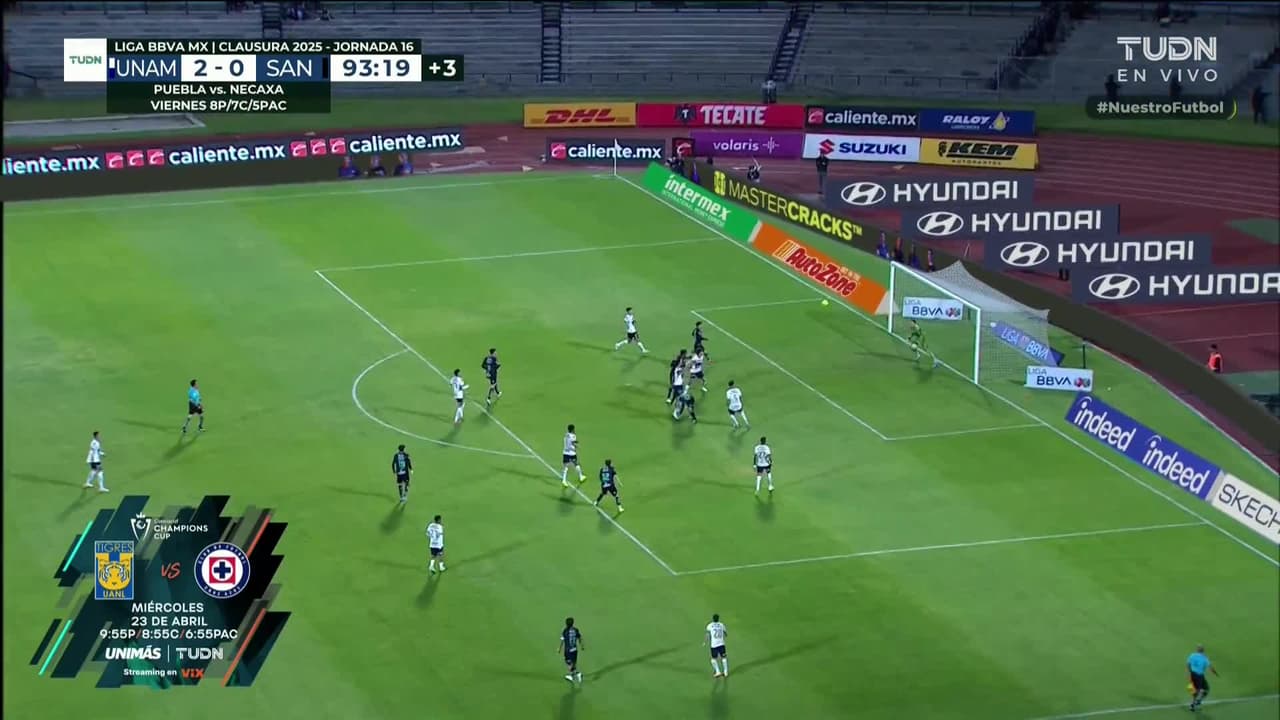 Tiro atajado Por arriba en el centro del arco. Guillermo Muñoz (Santos Laguna) disparo de cabeza desde el centro del área. Asistencia de Javier Abella con un centro al área.