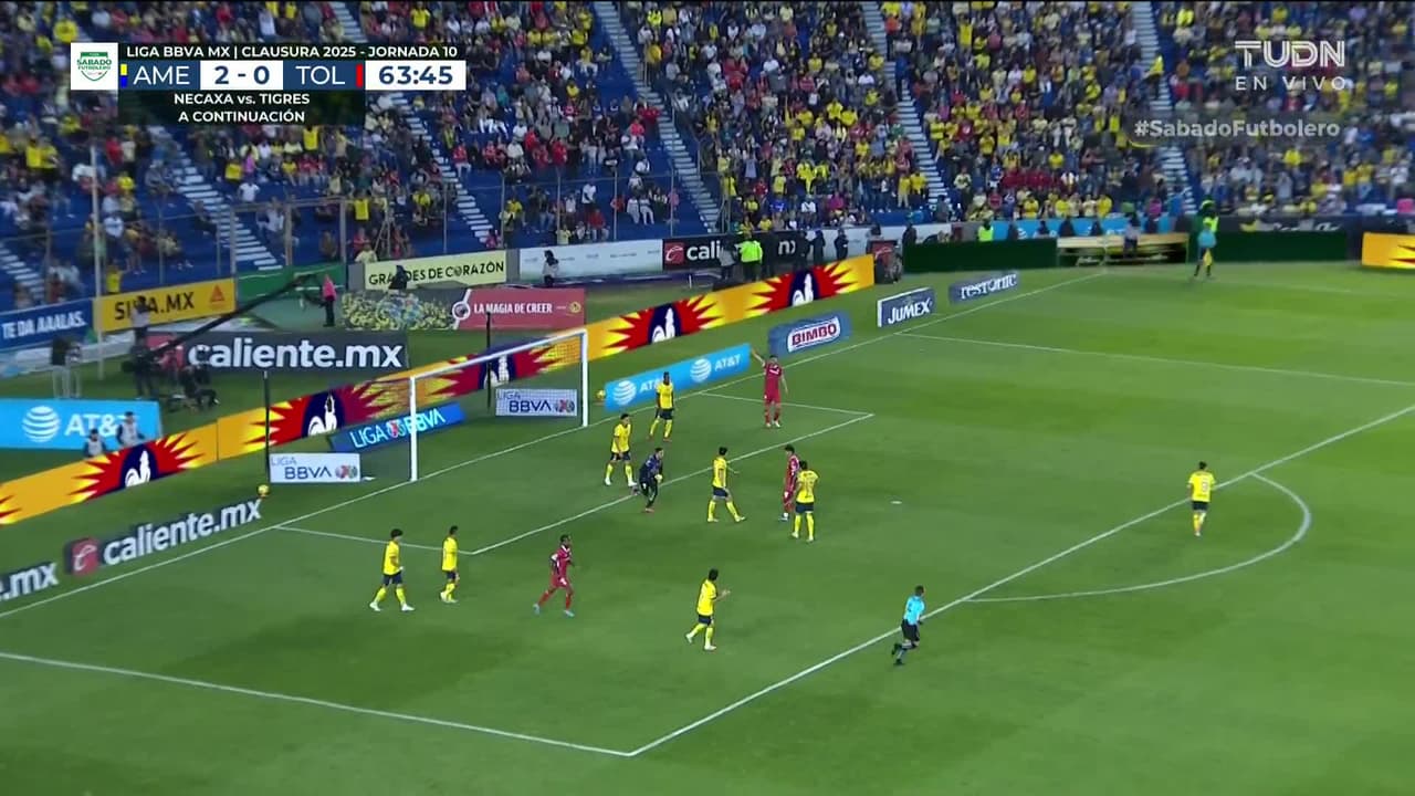 Tiro atajado junto al lado derecho de la portería. Helinho (Toluca) zurdazo desde el lado izquierdo dentro del área.