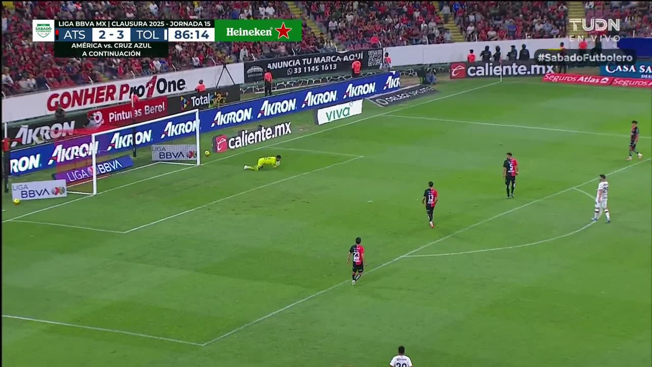 Tiro atajado junto al lado derecho de la portería. Helinho (Toluca) zurdazo desde fuera del área. Asistencia de Paulinho.