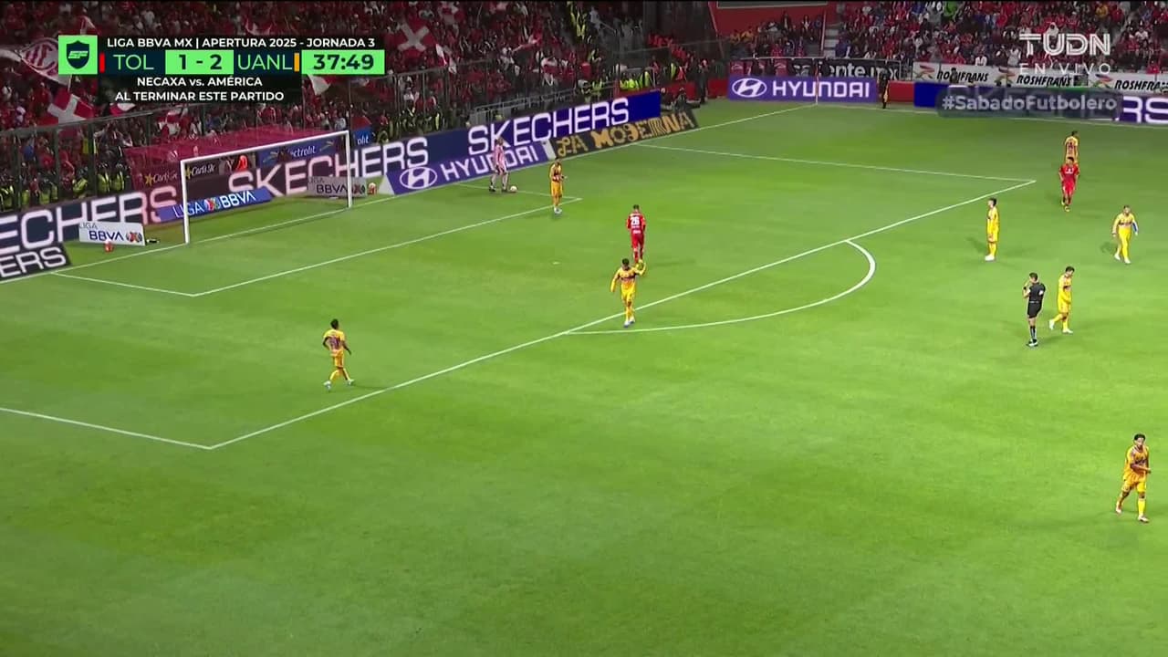 Tiro atajado. Helinho (Toluca) zurdazo desde la banda derecha.