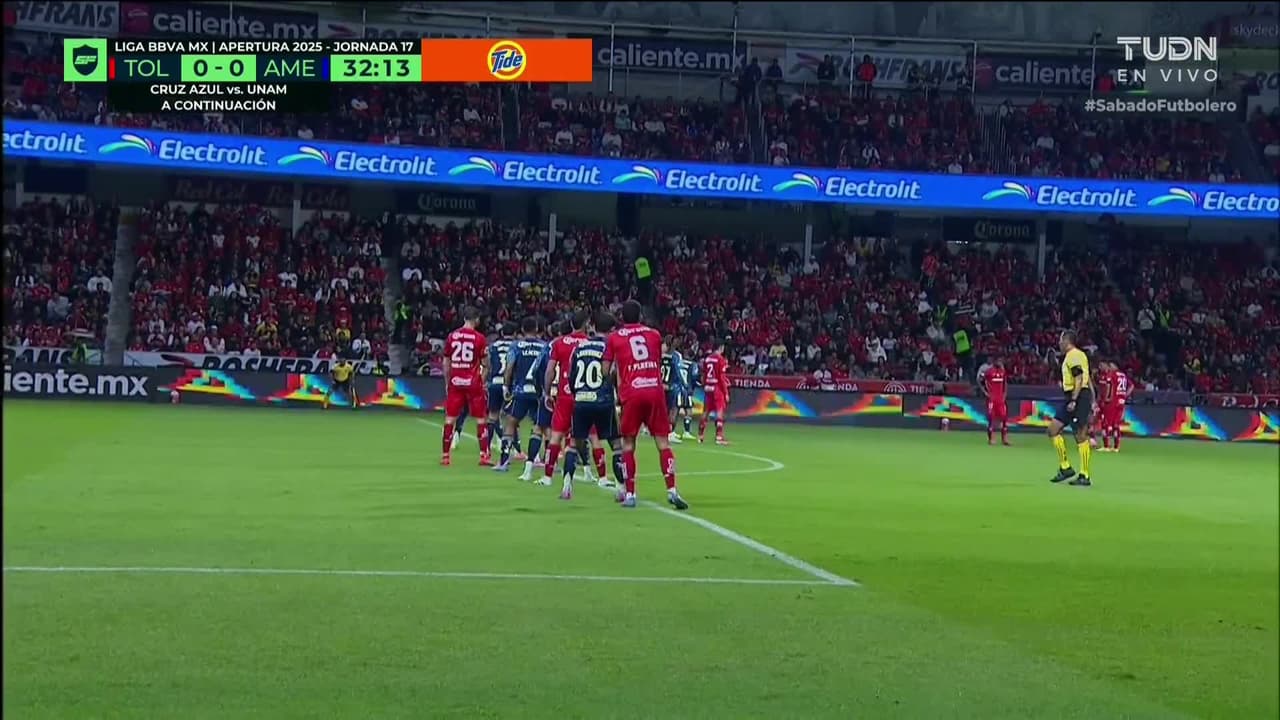Tiro atajado raso al centro del arco. Helinho (Toluca) zurdazo desde fuera del área. Asistencia de Jesús Gallardo.