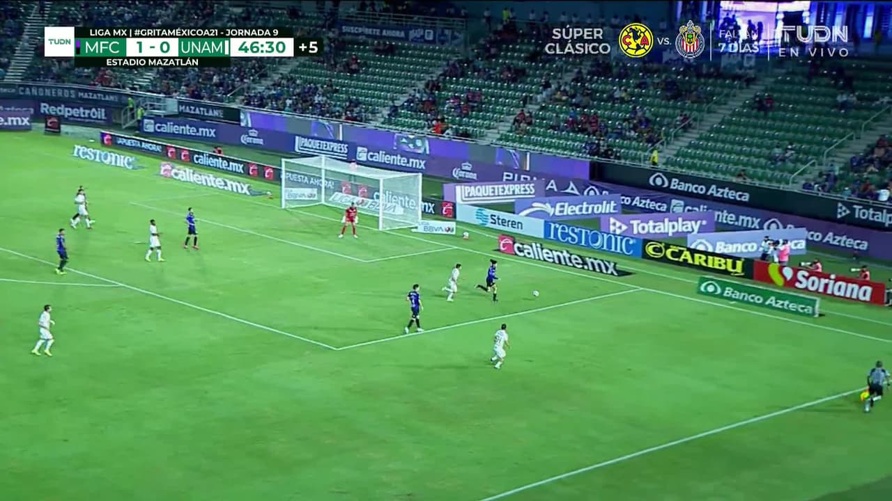 Remate parado. Higor Meritão (Pumas UNAM) remate con la izquierda desde fuera del área.