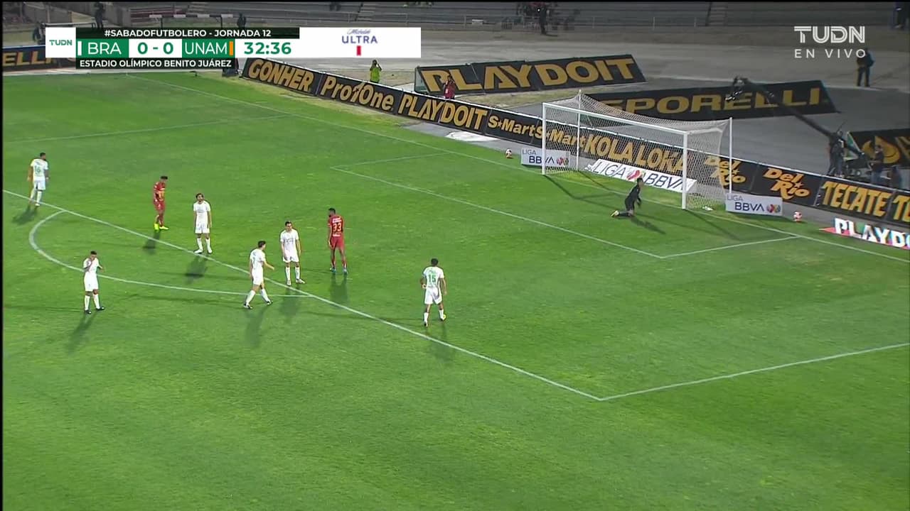 Tiro atajado. Higor Meritão (Pumas UNAM) zurdazo desde fuera del área.