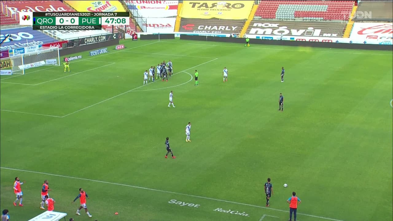 Tiro atajado. Hugo Silveira (Querétaro) disparo de cabeza desde el lado izquierdo dentro del área.