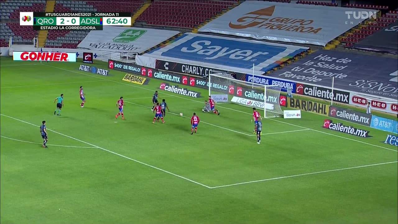 Tiro atajado raso al centro del arco. Hugo Silveira (Querétaro) Disparo con la derecha desde el centro del área. Asistencia de Kevin Ramírez.