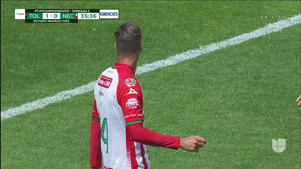 Tiro atajado. Ian González (Necaxa) disparo de cabeza desde el centro del área.