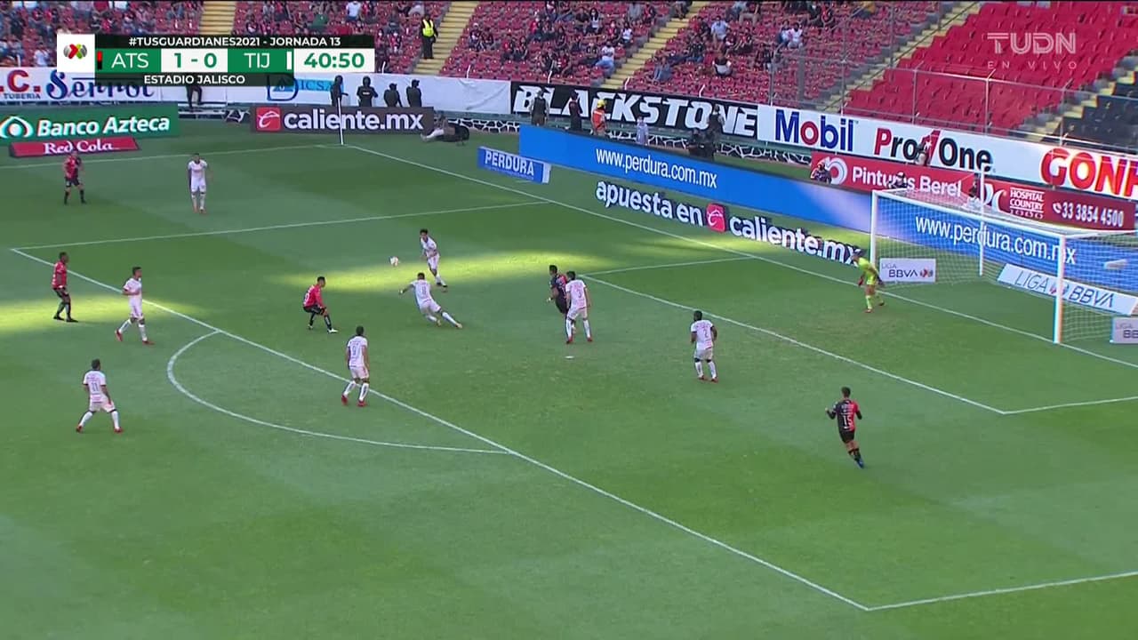 Tiro atajado. Jairo Torres (Atlas) Disparo con la derecha desde el lado derecho dentro del área.