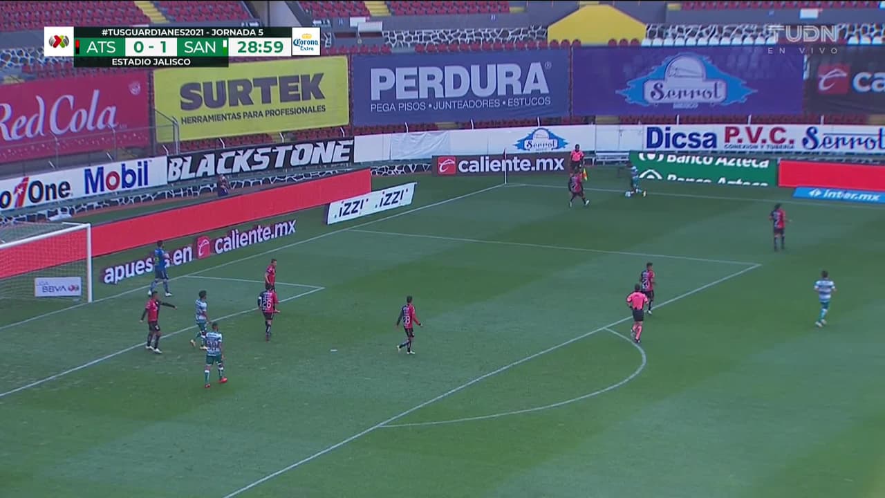 Tiro atajado raso al centro del arco. Ignacio Jeraldino (Santos Laguna) Disparo con la derecha desde muy cerca. Asistencia de Juan Ferney Otero.