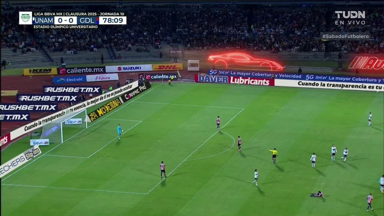 Tiro atajado. Ignacio Pussetto (Pumas UNAM) Disparo con la derecha desde fuera del área.
