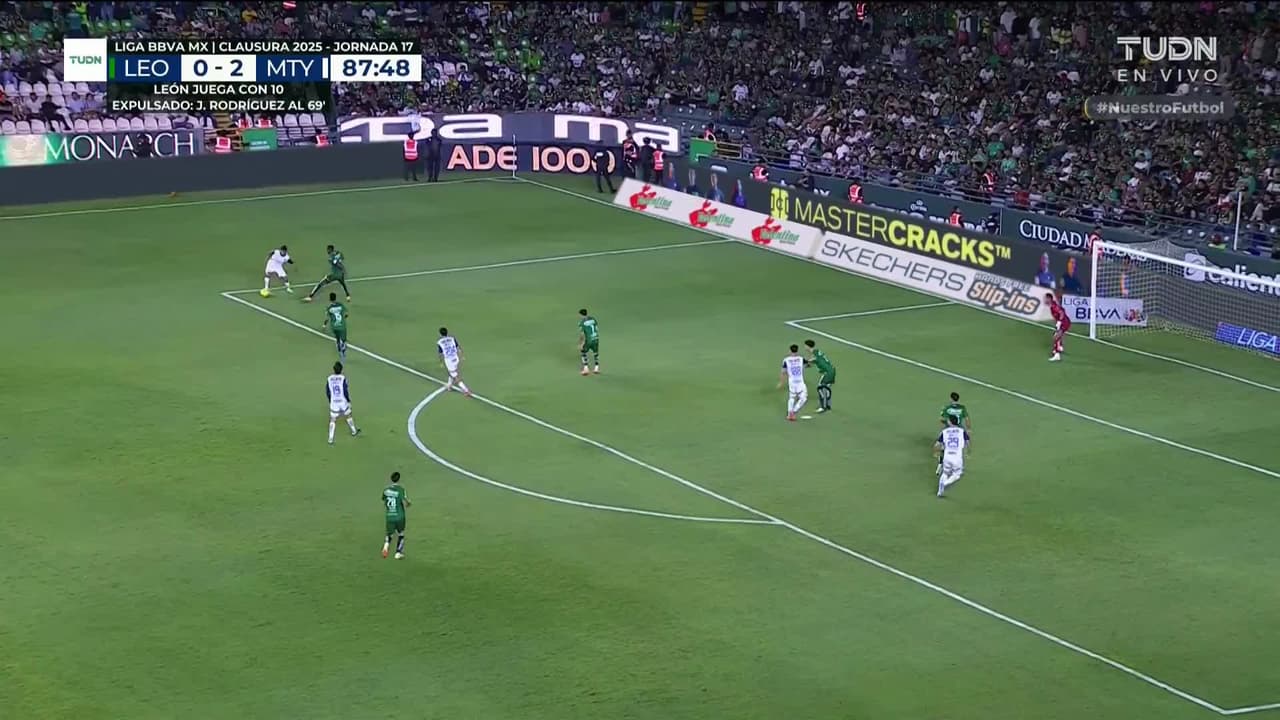 Tiro atajado al ángulo superior derecho. Iker Fimbres (Monterrey) Disparo con la derecha desde fuera del área.