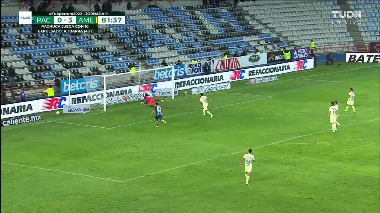 Tiro atajado raso al centro del arco. Illian Hernández (Pachuca) disparo de cabeza desde el centro del área. Asistencia de Jesús Hernández con un centro al área.