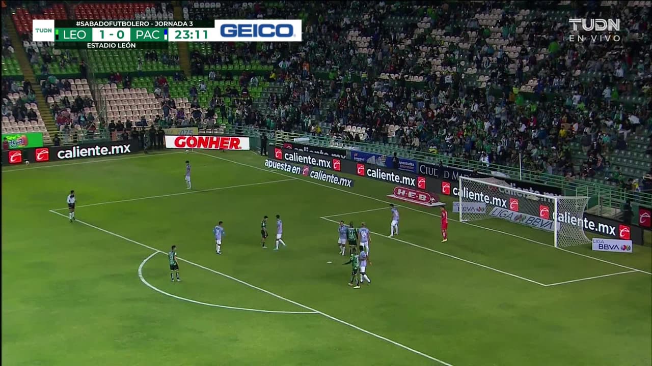 Tiro atajado al ángulo superior derecho. Jaine Barreiro (León) disparo de cabeza a quemarropa desde el lado derecho. Asistencia de Luis Montes.
