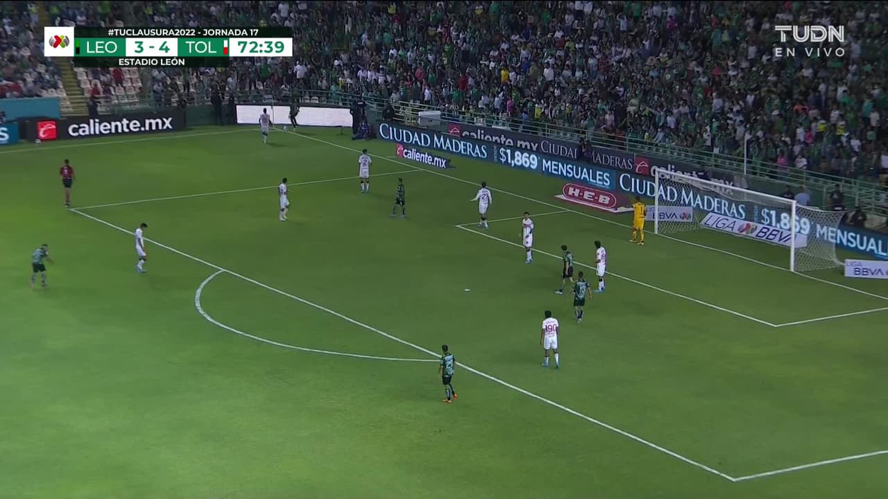 Tiro atajado Por arriba en el centro del arco. Jaine Barreiro (León) disparo de cabeza desde el centro del área. Asistencia de Luis Montes con un centro al área.