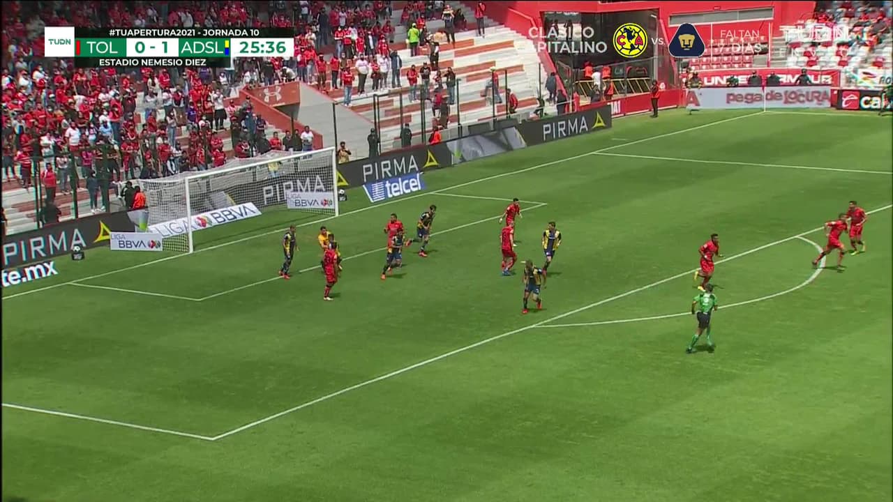 Tiro atajado. Jair Díaz (Atlético San Luis) zurdazo desde fuera del área.