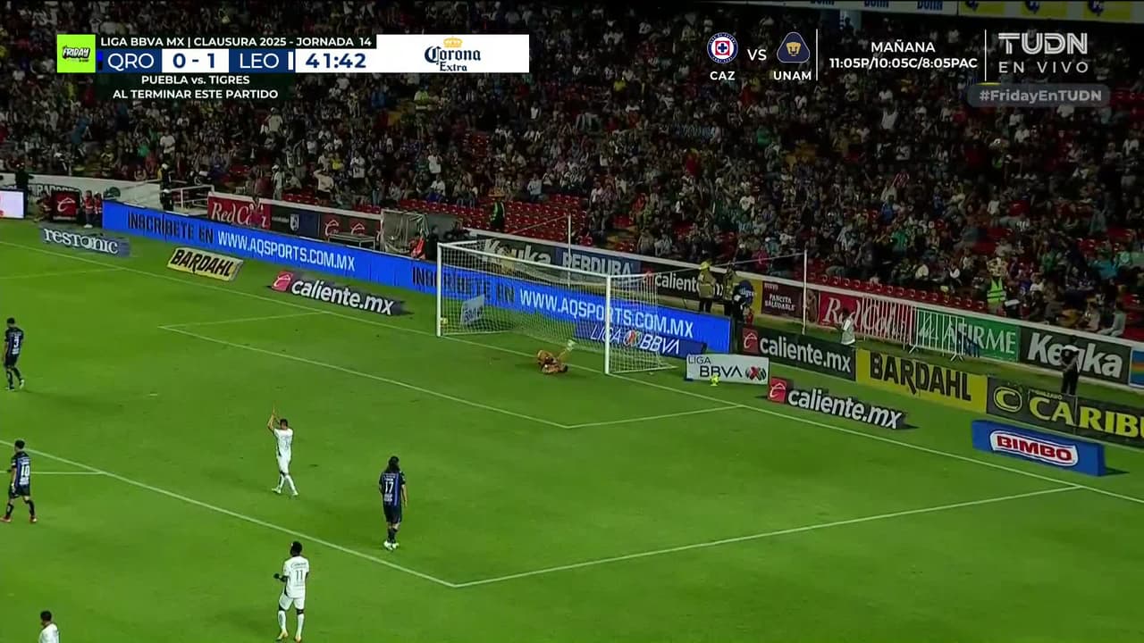 Tiro atajado Por arriba en el centro del arco. James Rodríguez (León) zurdazo desde fuera del área.