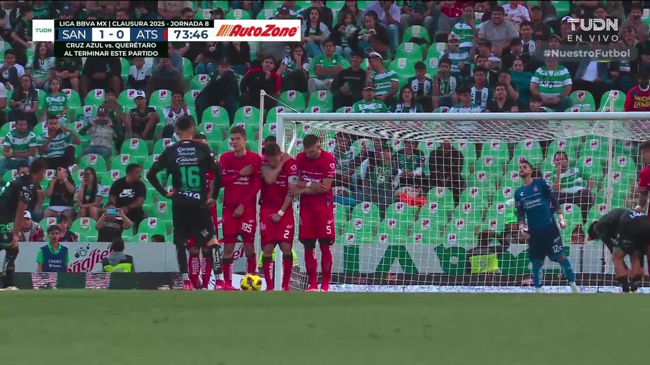 Tiro atajado al ángulo superior derecho. Javier Abella (Santos Laguna) Disparo con la derecha desde fuera del área.