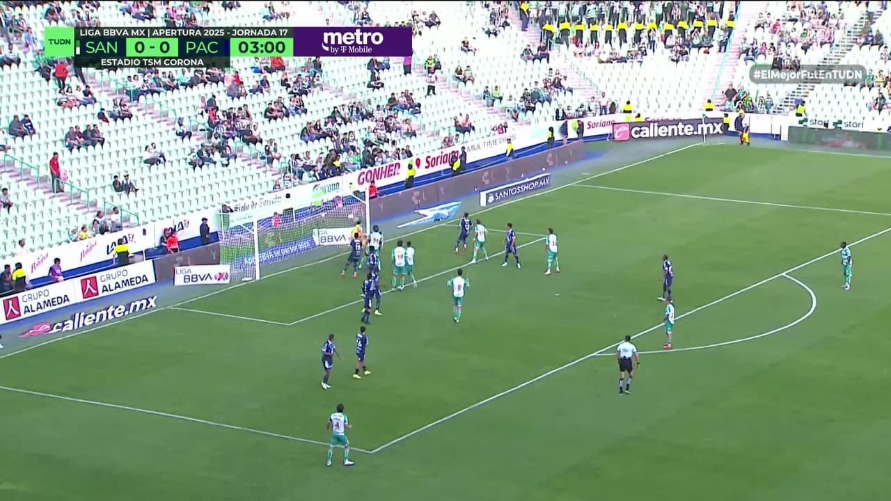 Tiro atajado. Javier Abella (Santos Laguna) Disparo con la derecha desde muy lejos por la izquierda y en posición complicada.