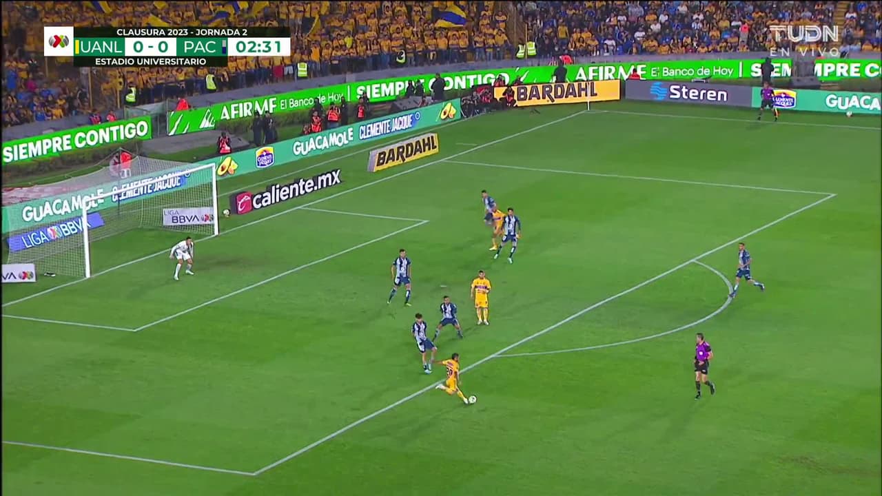 Tiro atajado. Javier Aquino (Tigres) Disparo con la derecha desde fuera del área.