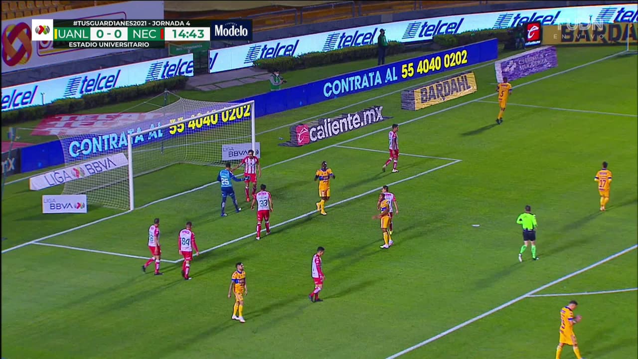 Tiro atajado. Javier Aquino (Tigres) Disparo con la derecha desde el lado izquierdo dentro del área.