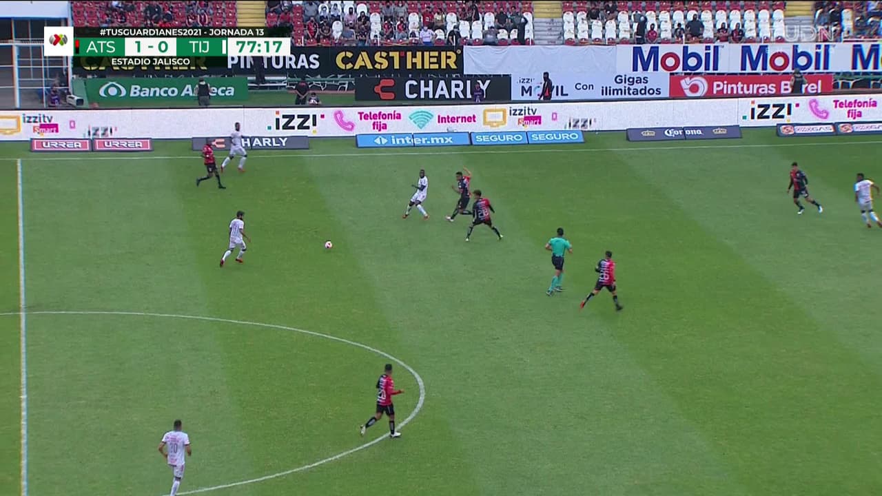 Tiro atajado. Javier Correa (Atlas) zurdazo desde el lado derecho dentro del área.