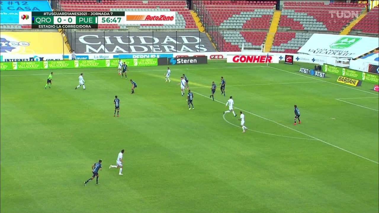 Tiro atajado. Javier Salas (Puebla) disparo de cabeza desde el centro del área.