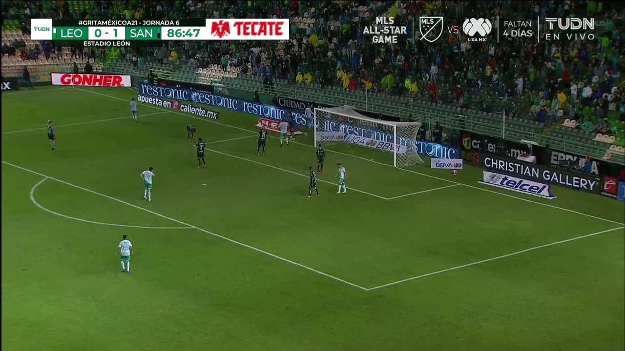 Tiro atajado raso al centro del arco. Jean Meneses (León) zurdazo desde el lado izquierdo dentro del área. Asistencia de Emanuel Gigliotti.