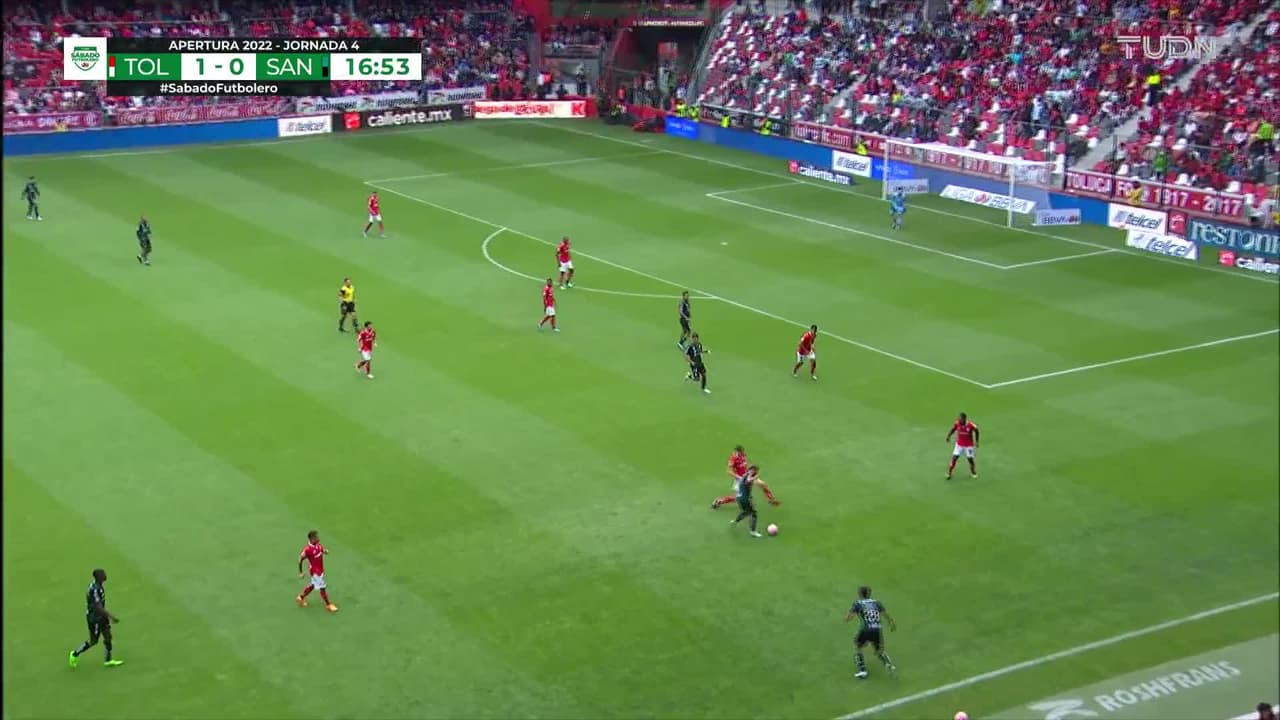 Tiro atajado por abajo a la izquierda. Jean Meneses (Toluca) Disparo con la derecha desde fuera del área.