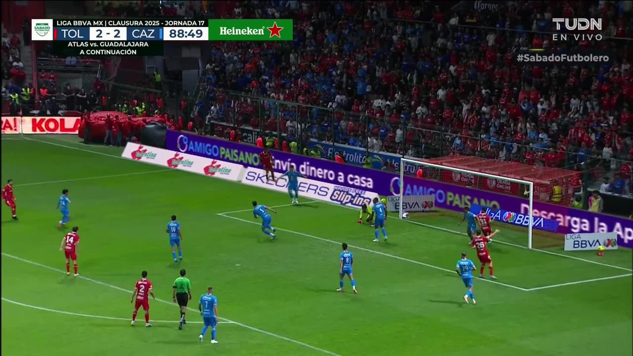 Tiro atajado. Jesús Gallardo (Toluca) zurdazo sin ángulo desde la izquierda.