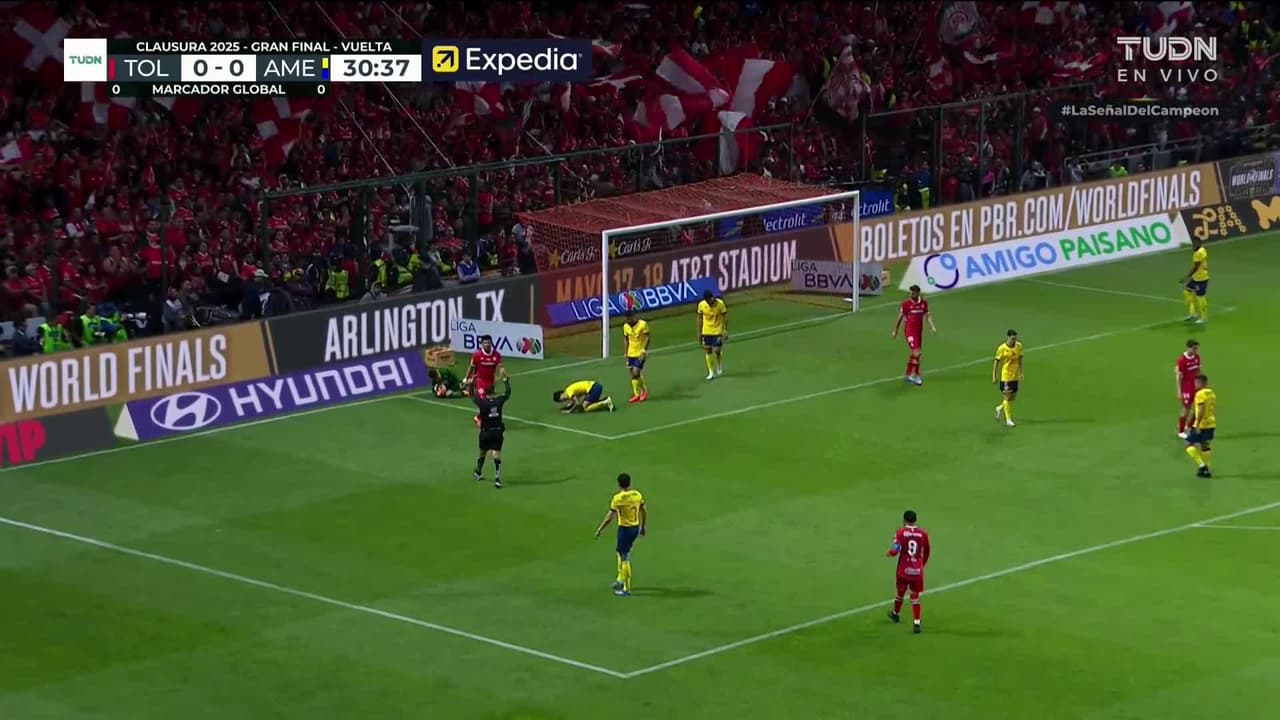 Tiro atajado por abajo a la izquierda. Jesús Gallardo (Toluca) zurdazo a quemarropa desde el lado izquierdo.