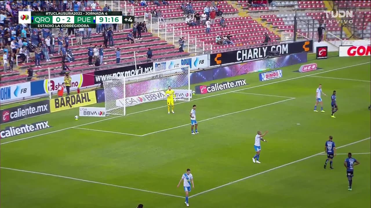 Tiro atajado raso al centro del arco. Jesús Godínez (Querétaro) zurdazo desde fuera del área.