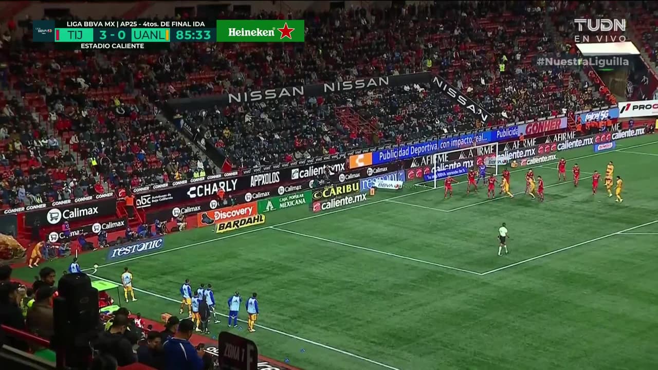 Tiro atajado Por arriba en el centro del arco. Joaquim (Tigres) disparo de cabeza a quemarropa desde el lado izquierdo. Asistencia de Ángel Correa con un centro al área.