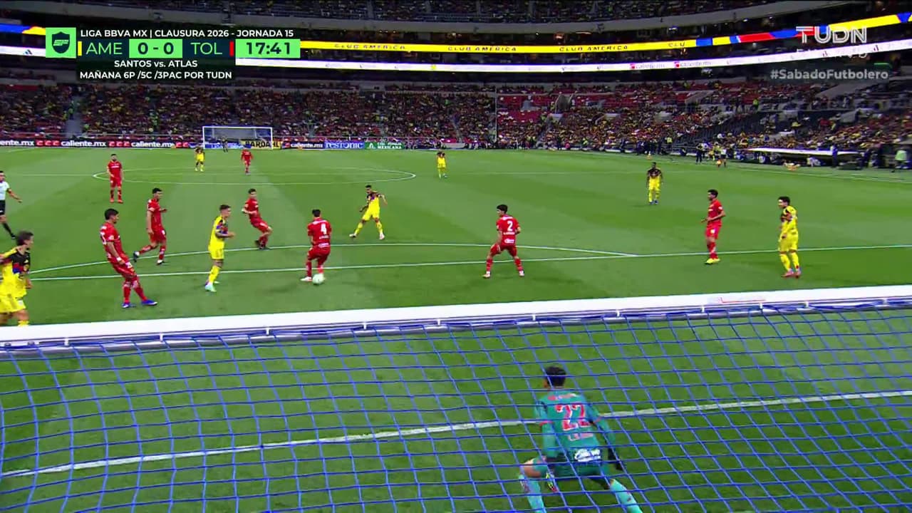 Tiro atajado raso al centro del arco. Jonathan dos Santos (América) Disparo con la derecha desde fuera del área. Asistencia de Brian Rodríguez.