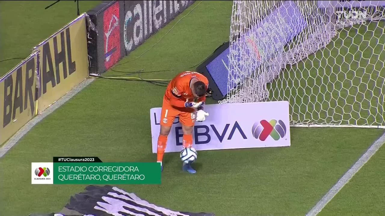 Tiro atajado por abajo a la izquierda. Jonathan Perlaza (Querétaro) zurdazo desde más de 30 metros.