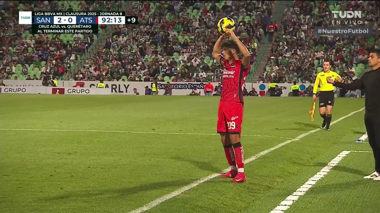 Tiro atajado junto al lado derecho de la portería. Jordán Carrillo (Santos Laguna) Disparo con la derecha desde el lado derecho dentro del área. Asistencia de Aldo López.